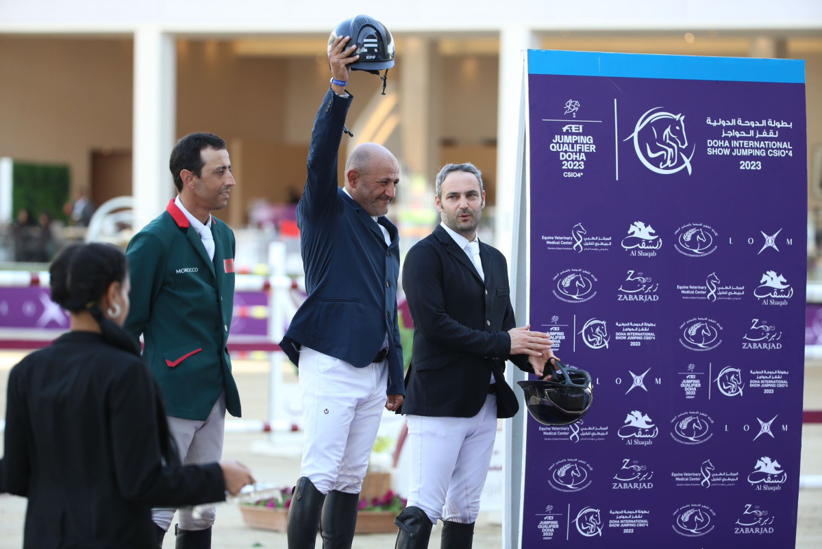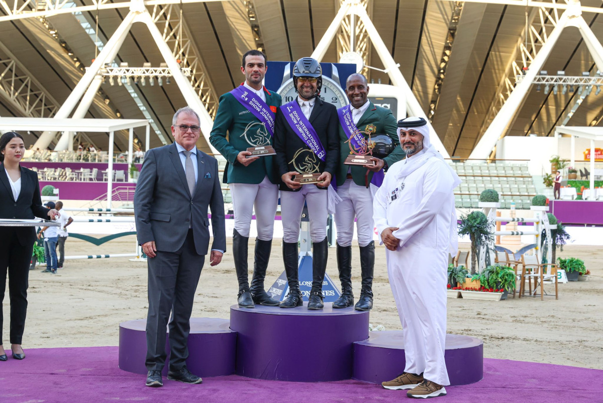 Grand Prix podium winners of the Doha International Showjumping Championship pose with Qatar Equestrian Federation’s Technical Director and former Olympic rider Ali Yousef Al Rumaihi and President of the Ground Jury Stephan Ellenbruch.