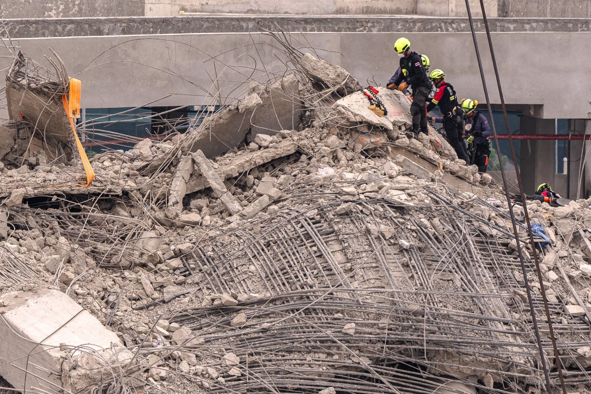 Rescue workers stand on the top of the rubble at the site of an under-construction building collapse in Bangkok on April 1, 2025. Photo by Chanakarn Laosarakham / AFP