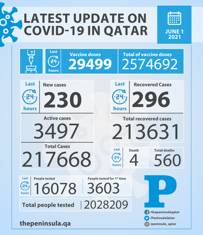 Doha: Ministry of Public Health (MoPH) today reported 230 new cases of coronavirus (Covid-19) and 296 people recovered from the virus in the last 24 hours, bringing the total number of people recovered in Qatar to 213632.