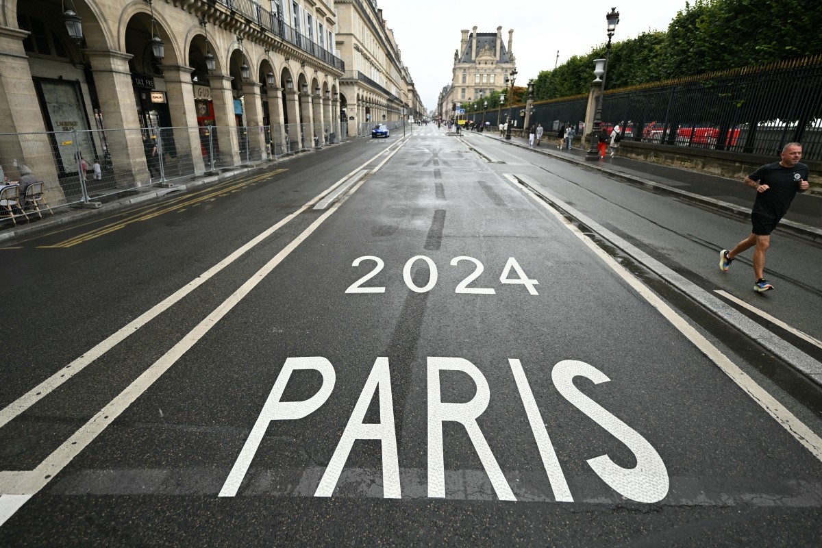 A man runs along Rue de Rivoli, which has been temporarily blocked off due to the Paris 2024 Olympic Games, in Paris on July 27, 2024. (Photo by Kirill KUDRYAVTSEV / AFP)