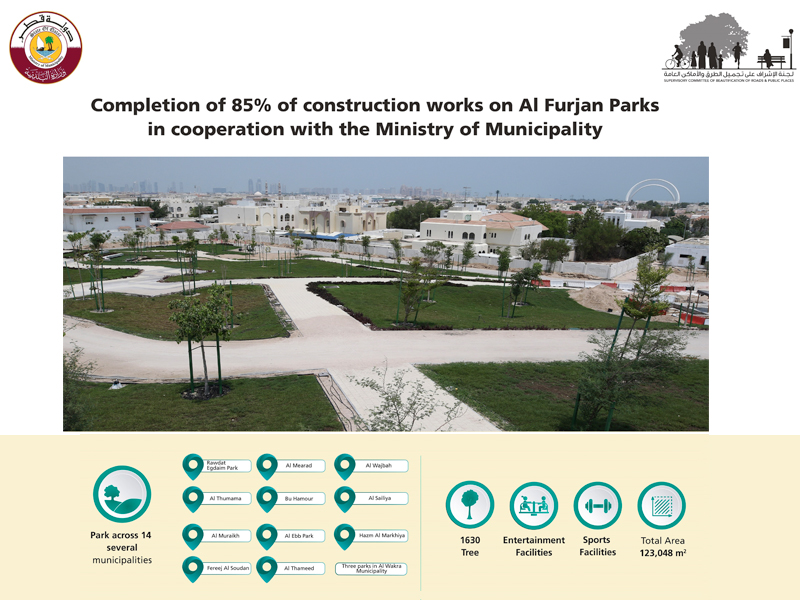 The Supervisory Committee of Beautification of Roads and Public Places in Qatar, in cooperation with the Ministry of Municipality, has announced the completion of 85% of the construction works in Al Furjan Parks in various areas across Qatar, including 14 parks with an area of 123,048 m2 containing various entertainment and sports facilities distributed over several municipalities.