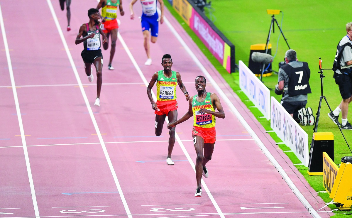 Ethiopia’s Muktar Edris (right) winning the men’s 5000 metres final during the 2019 IAAF Athletics World Championships in Doha, yesterday. Picture: Abdul Basit / The Peninsula