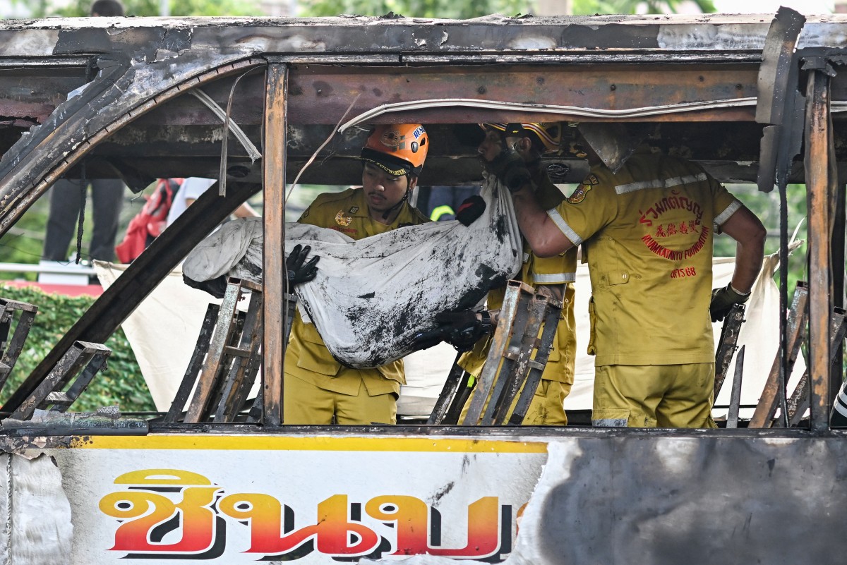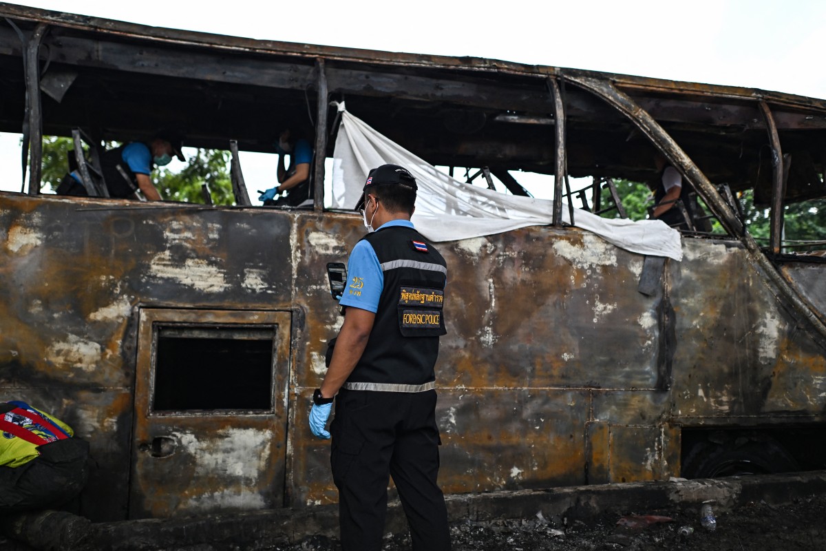 A devastating blaze tore through the coach on a highway in a northern Bangkok suburb as it carried 38 children -- ranging from kindergarten age to young teenagers -- and six teachers on a school trip.