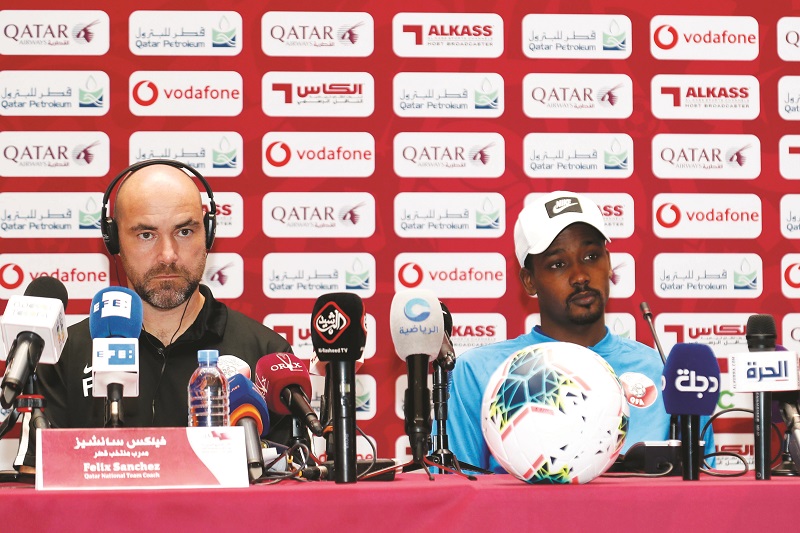 Qatar coach Felix Sanchez (left) and defender Musab Khader during a press conference yesterday.