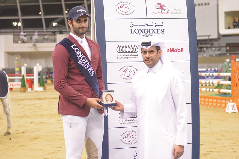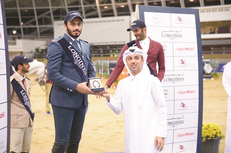 Al Suwaidi won the 130/145 cm class event with Cantaro 32. Omar Al Mannai, Vice-Chairman, Organizing Committee Longines Hathab, is seen during the prize distribution ceremony.