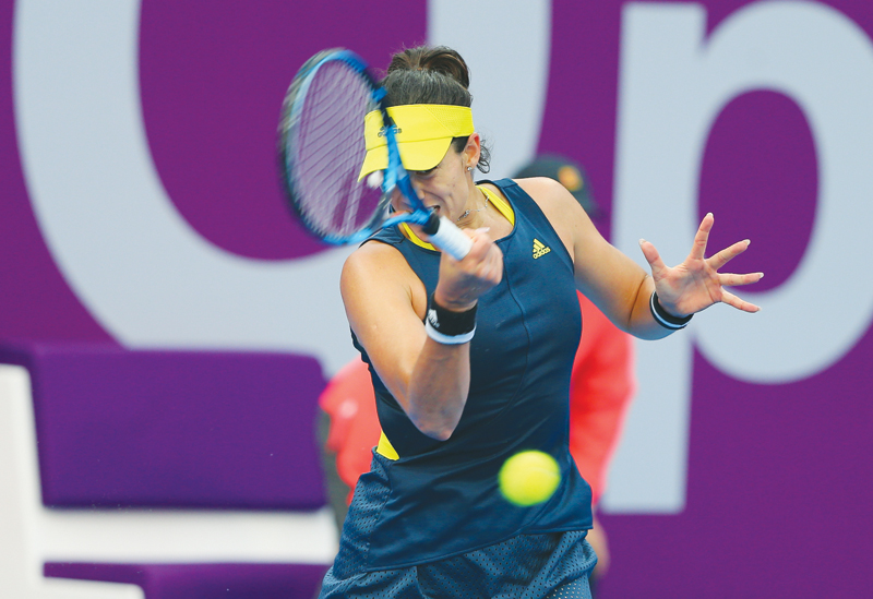 Garbine Muguruza of Spain hits a return shot to Veronika Kudermetova of Russia during their Qatar Total Open Round of 32 match played at the Khalifa International Tennis and Squash Complex, yesterday.
