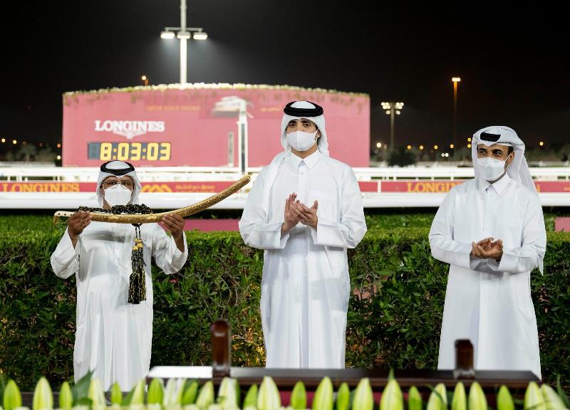 Ronan Thomas guides Tayf past the finish line in the feature of the day at Qatar Racing and Equestrian Club’s Al Rayyan Race Park. Tayf won Gr 1 P/A Qatar Gold Sword .