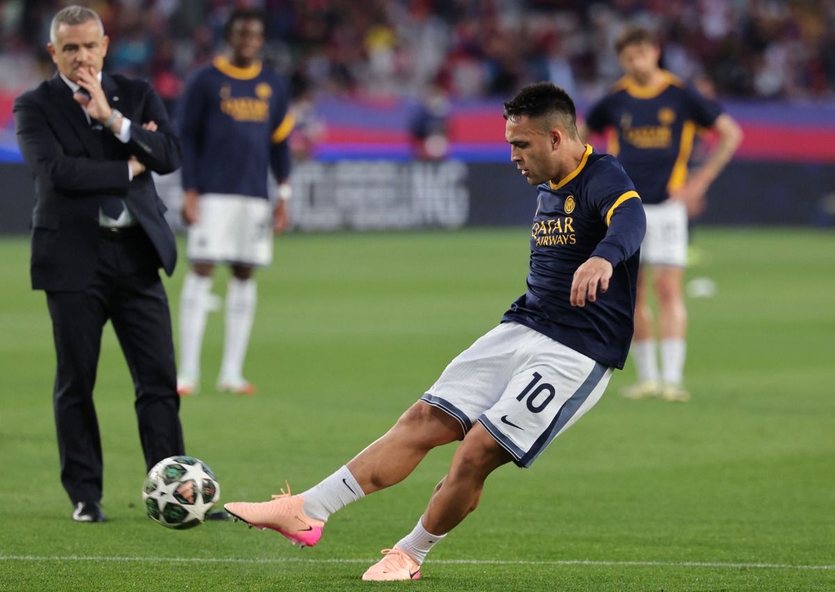 Inter Milan's Argentine forward #10 Lautaro Martinez warms up before the UEFA Champions League semi final first leg football match between FC Barcelona and Inter Milan at the Estadi Olimpic Lluis Companys in Barcelona on April 30, 2025. (Photo by LLUIS GENE / AFP)