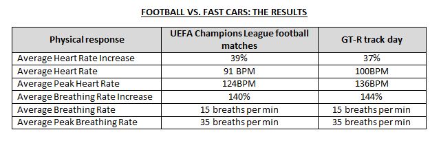 Throughout the two sets of experiments the heart rates of football fans and Nissan GT-R passengers were broadly comparable, with them increasing at peak moments as you would expect – such as when a goal was scored or driving round a tight corner.