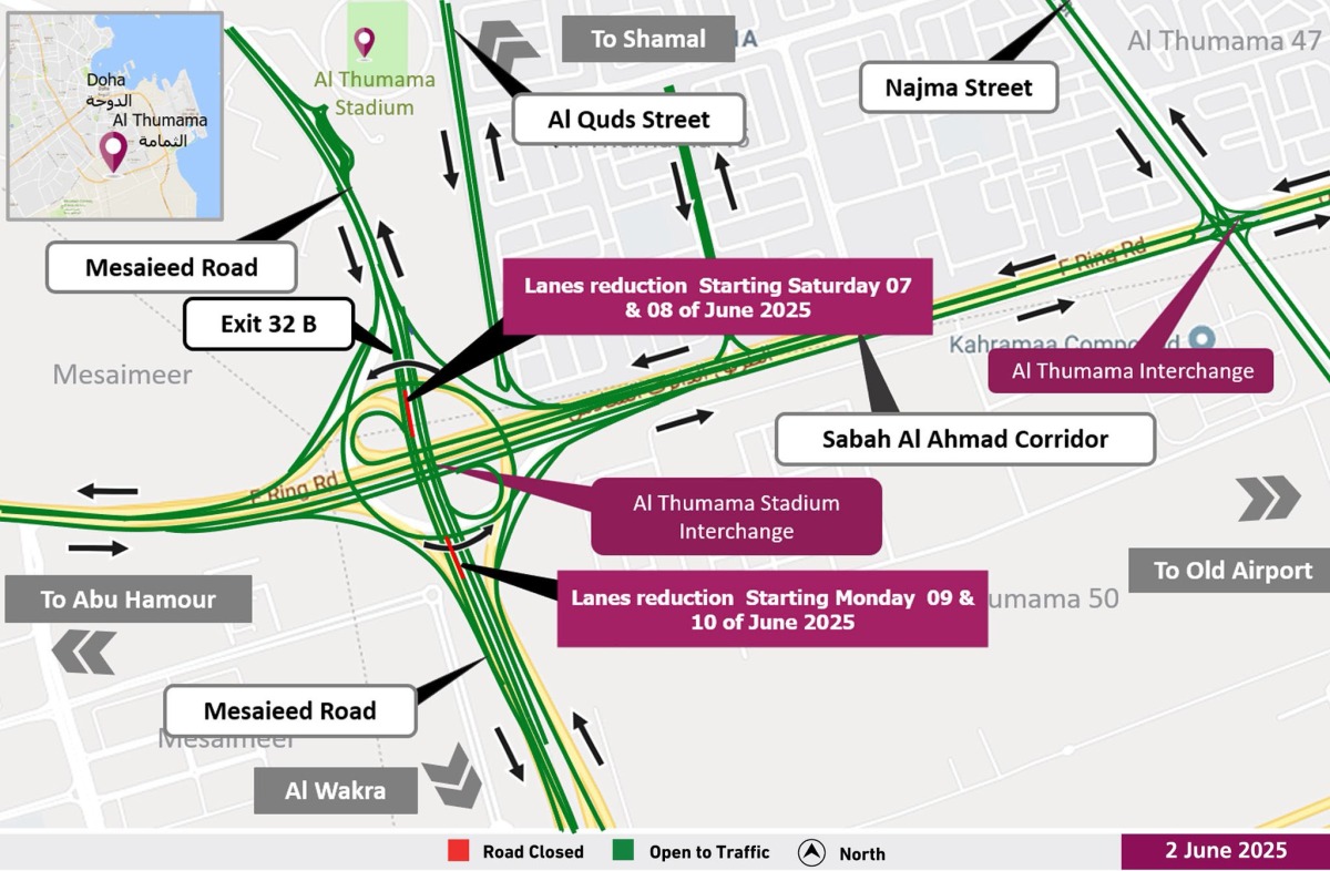 During the closure period, which is coordinated with the General Traffic Department, road users coming from Mesaieed Road towards Al Wakra Road should use the remaining lanes to reach their destination as indicated on the map.