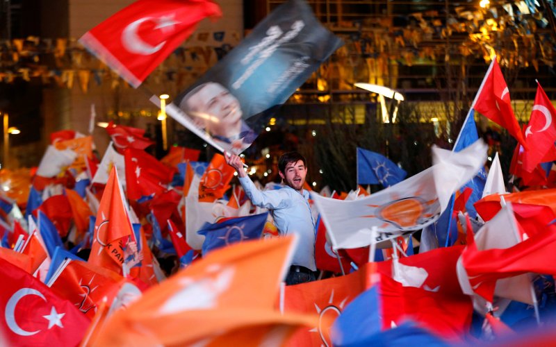 "Recep Tayyip Erdogan has become not only a European leader, but also a world leader. We believe in him, we trust him and with the help of God, he can achieve anything," said Yasin Aktay as he joined boisterous celebrations near AKP headquarters in Istanbul.