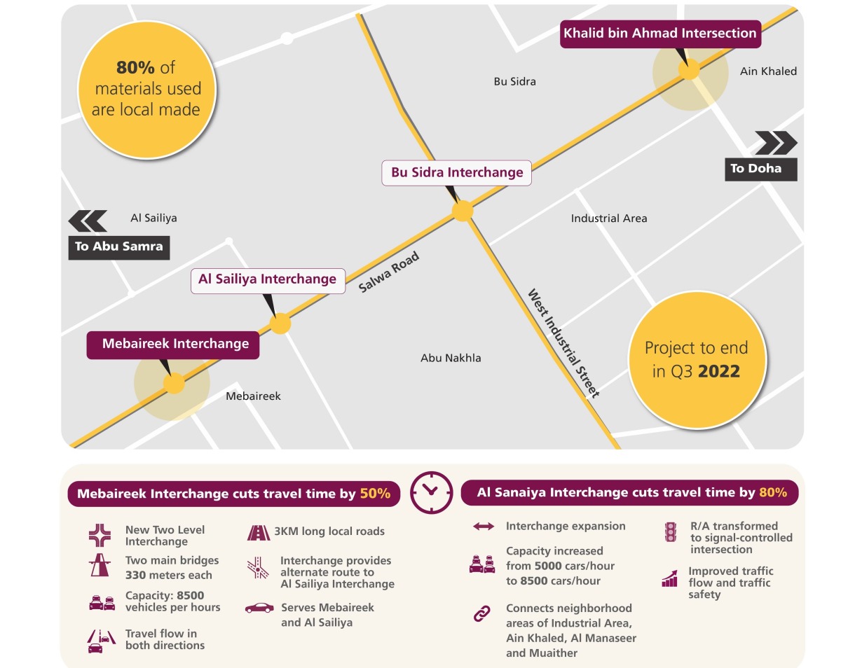 The project aims to enhance traffic flow on Salwa Road for commuters heading to Industrial Area and the surrounding areas such as Ain Khaled, Al Murrah, New Fereej Al Ghanim, Muaither, Al Sailiya, Mebaireek and Abu Nakhlah. The project is due by the third quarter of 2022.