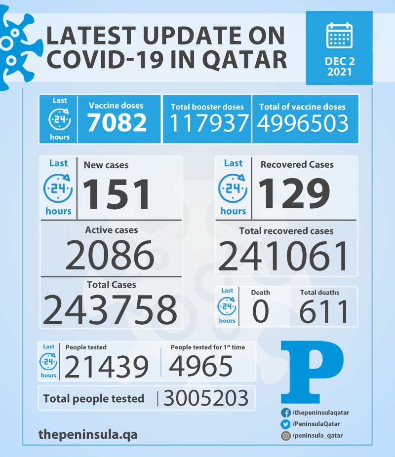 Doha: The Ministry of Public Health (MoPH) has announced the number of Coronavirus (COVID-19) cases recorded today, December 2, 2021.