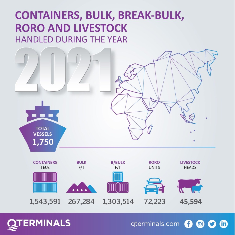 In 2020, Hamad Port handled 1,412,689 TEU containers; 304,481 tonnes of bulk cargo; 1,196,559 tonnes of general cargo; 59,443 vehicles; and 264,164 heads of livestock. In a tweet, QTerminals also released figures of cargo handling at Hamad Port in December 2021.