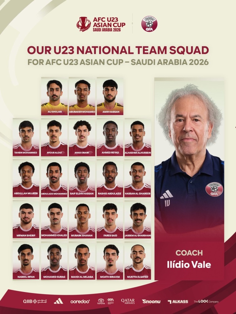 Doha, Qatar: Portuguese coach Ilidio Vale yesterday announced the Qatar U-23 team’s 23-man squad for the upcoming AFC U-23 Asian Cup set to kick off on Tuesday in Saudi Arabia.