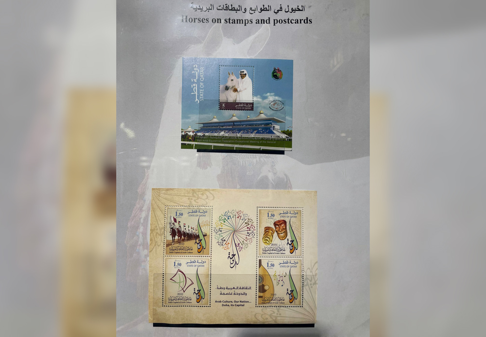 The exhibit centre displays six frames of horse stamps with envelopes, each frame contains 16 panels, and four frames for black and white horses, in addition to two frames for hunting stamps. It is open from 7am to 10pm at Katara Building 22.