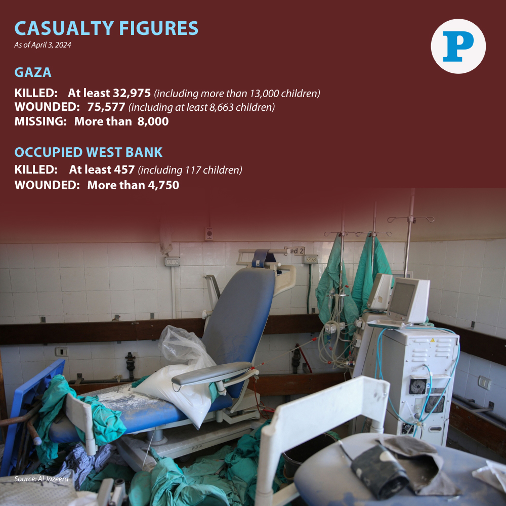 Gaza: The Ministry of Health in Gaza announced on Wednesday that the death toll from the ongoing Israeli aggression on the Gaza Strip since October 7 has risen to 32,975 martyrs in addition to 75,577 wounded, majority of whom are women and children.