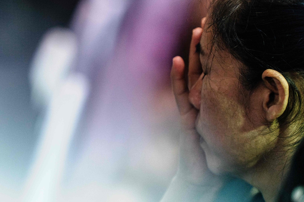 A mourner reacts before prayers for the victims of a school bus fire near their coffins at Wat Khao Phraya Sangkharam School in Uthai Thani on October 3, 2024. Photo by Chanakarn Laosarakham / AFP