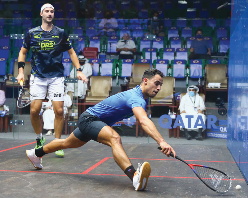 Egypt's Mohamed ElShorbagy in action against Englishman George Parker during the second round of the Qatar Classic Squash Championship at Khalifa International Tennis and Squash Complex, yesterday.