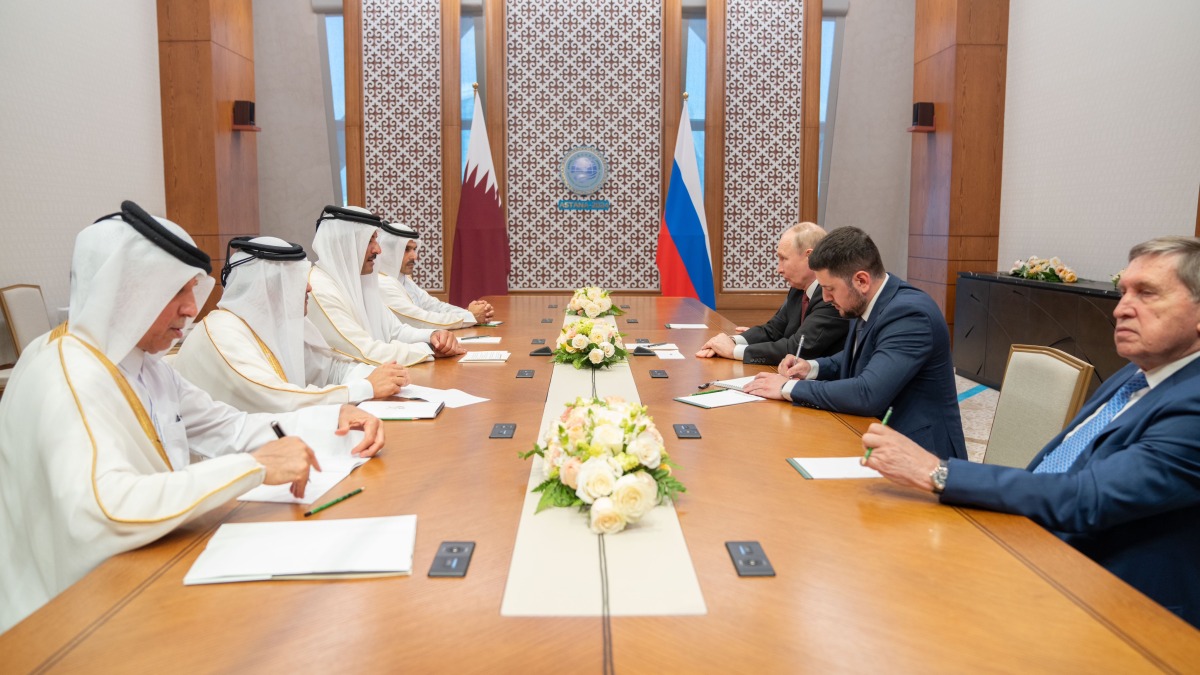 The Amir His Highness Sheikh Tamim bin Hamad Al Thani met today with His Excellency Vladimir Putin, President of the friendly Russian Federation, on the sidelines of the Shanghai Cooperation Organization summit in the Kazakh capital, Astana.