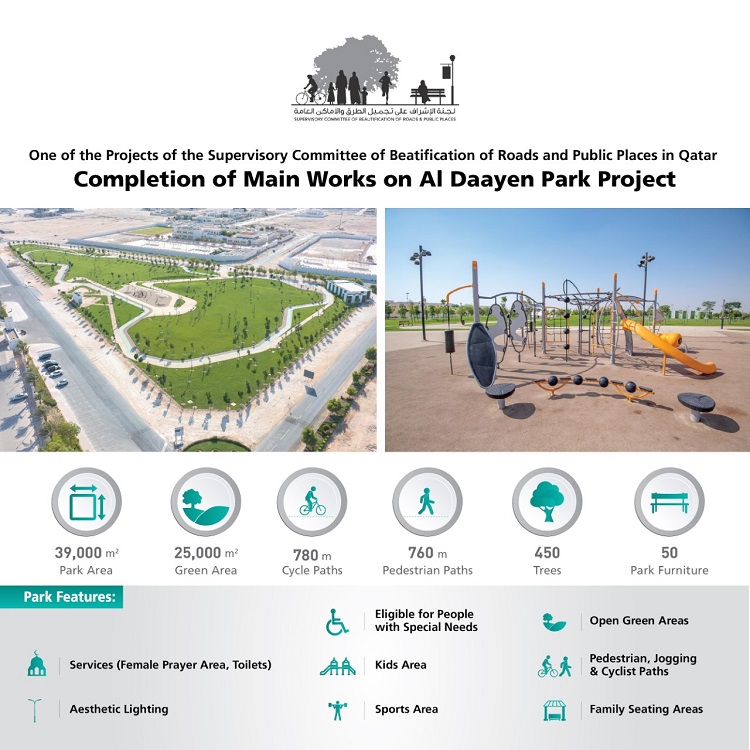 Al Daayen Park includes open green spaces with an area of 25,000 square metres, with benches and retiring facilities, along with 450 trees, making it a preferred visit space for families of Al Daayen and Simaisma. It also includes dedicated kids play areas, sports arena, and dedicated paths for pedestrians, joggers, and cyclists. The park is also designed to be user friendly for people with special needs.