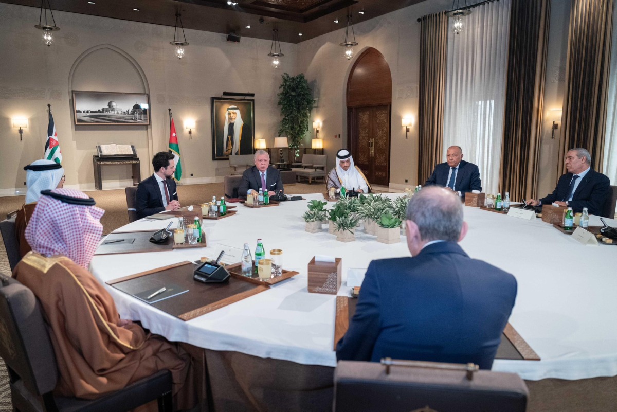 Amman: HM King Abdullah II ibn Al Hussein of the sisterly Hashemite Kingdom of Jordan met on Saturday with Prime Minister and Minister of Foreign Affairs HE Sheikh Mohammed bin Abdulrahman bin Jassim Al-Thani, Minister of Foreign Affairs of the United Arab Emirates HH Sheikh Abdullah bin Zayed Al-Nahyan, Minister of Foreign Affairs of the Kingdom of Saudi Arabia HH Prince Faisal bin Farhan bin Abdullah Al-Saud, Minister of Foreign Affairs of the Arab Republic of Egypt HE Sameh Shoukry, and Secretary-General of the Executive Committee of the Palestine Liberation Organization HE Hussein Al Sheikh, who participated in the coordination meeting on Gaza held today in the context of their efforts to stop the Israeli war on Gaza and the resulting humanitarian catastrophe.