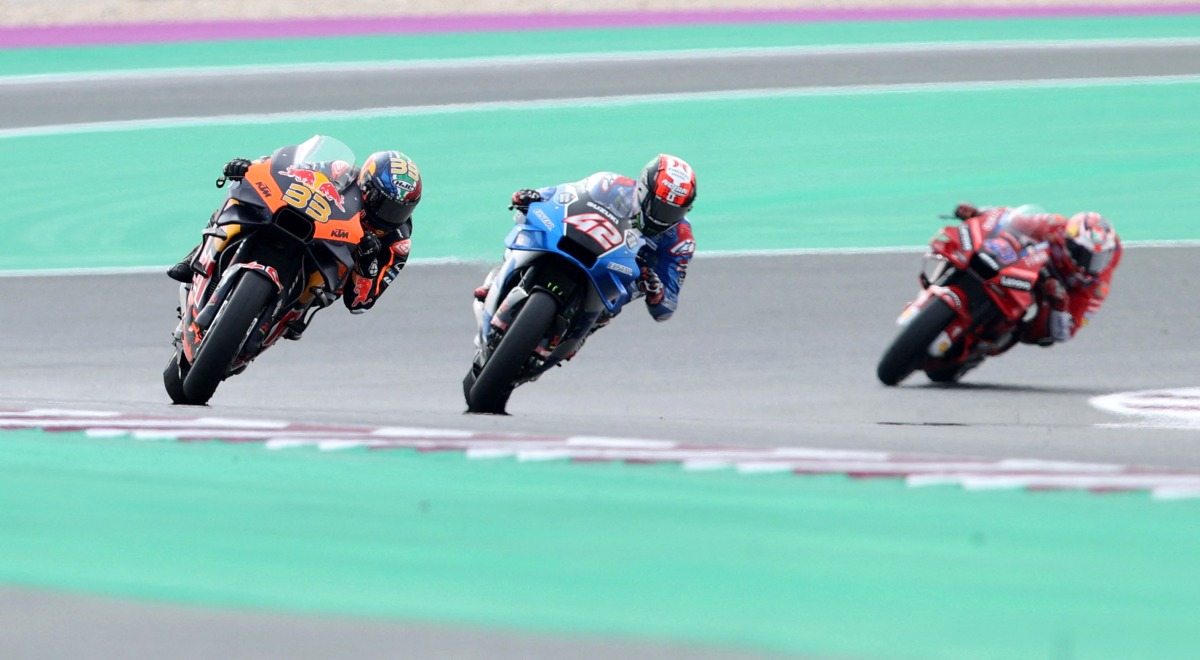 Red Bull KTM Factory Racing’s Brad Binder, Team Suzuki Ecstar’s Alex Rins and Ducati Lenovo’s Jack Miller in action during practice at the Losail International Circuit, yesterday.