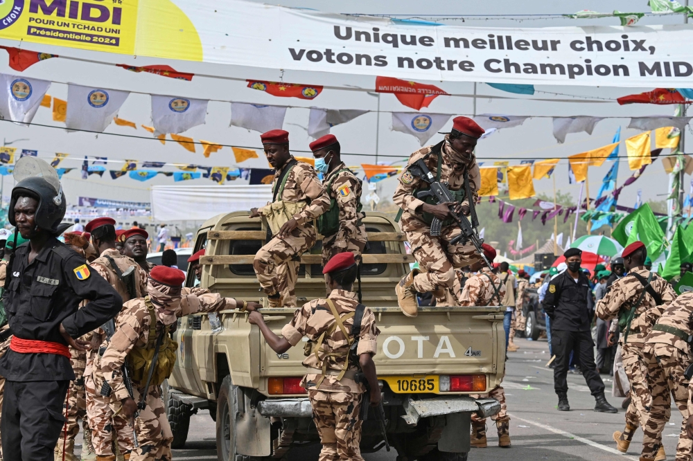 Servicemen stand guard during a final presidential election campaign rally in N'Djamena on May 4, 2024. (Photo by Issouf Sanogo / AFP)