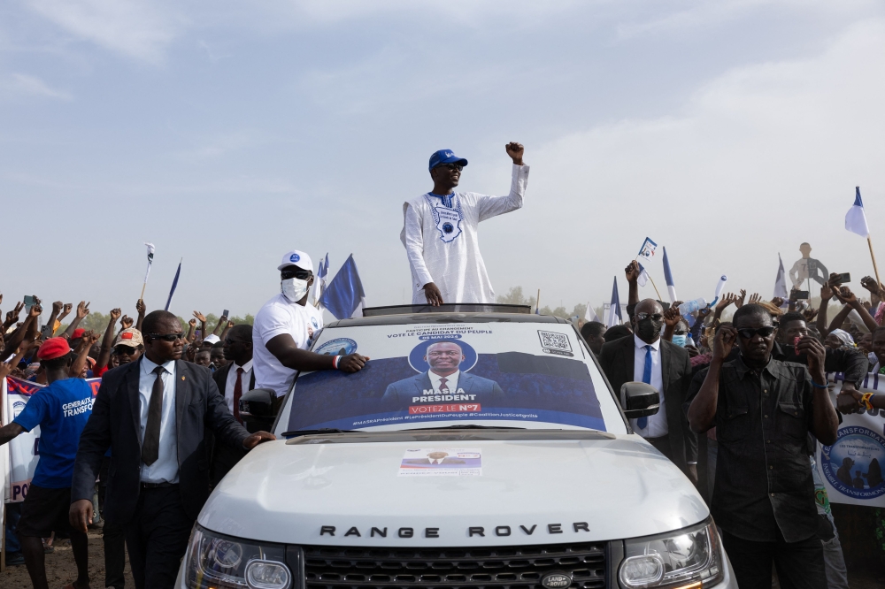 Chad's transitional Prime Minister and Les Transformateurs party presidential candidate Succes Masra (C). (Photo by Joris Bolomey / AFP)