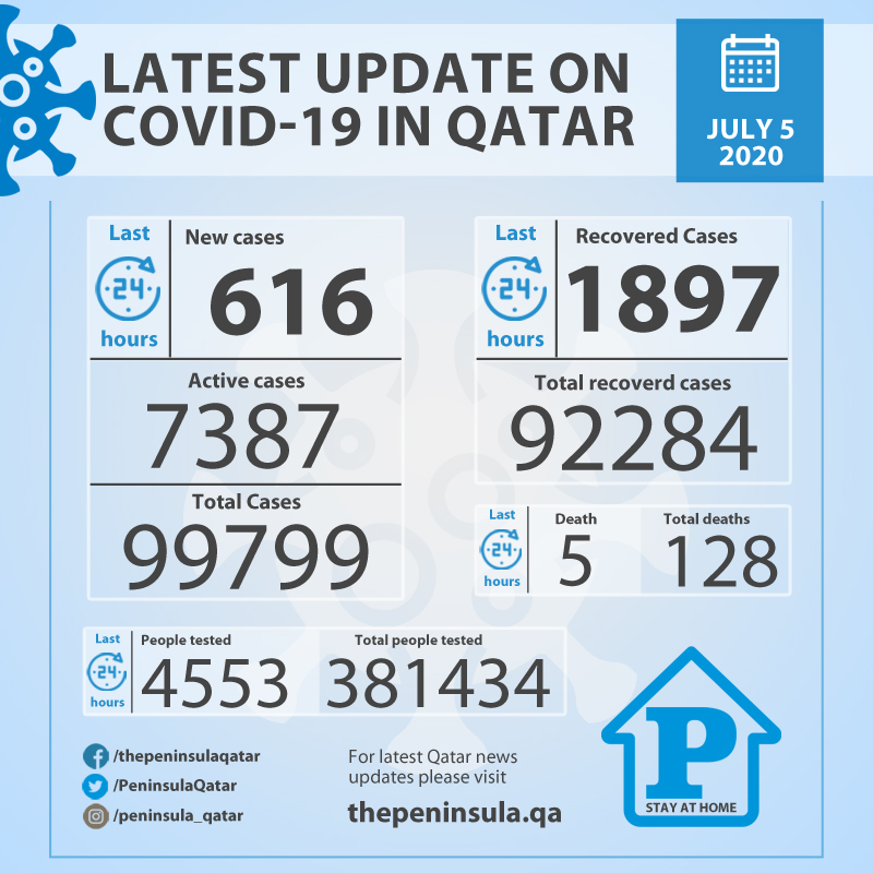 Ministry of Public Health today confirmed 616 new cases of coronavirus (COVID-19) and 1897 recoveries from the virus in the last 24 hours, bringing the total number of people recovered from the disease in Qatar to 92284. The Ministry also announced five deaths.