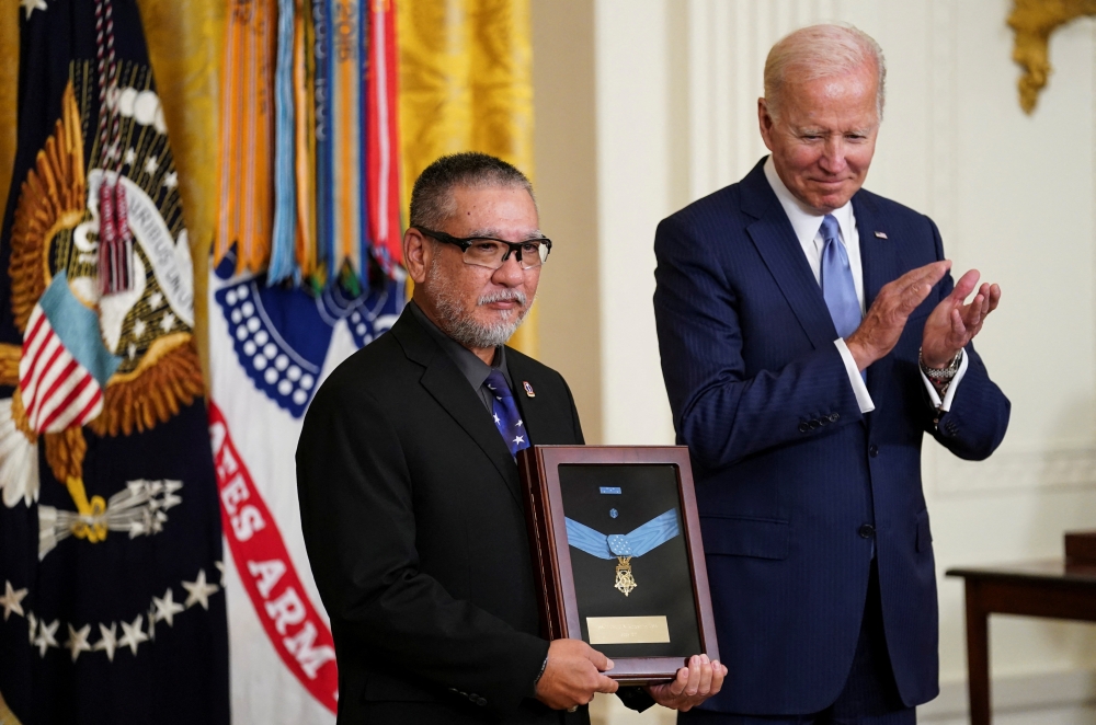 US President Joe Biden applauds as he presents the Medal of Honor to John Kaneshiro in posthumous memory of his father US Army veteran Staff Sergeant Edward Kaneshiro, who fought in the Vietnam War, during a ceremony in the East Room at the White House in Washington, US, July 5, 2022. (Reuters/Kevin Lamarque)