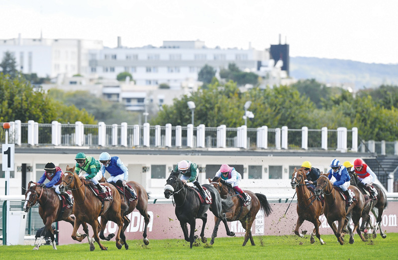 Italian jockey Cristian Demuro (second right) riding Sottsass to victory in the Qatar Prix de l’Arc de Triomphe, yesterday.