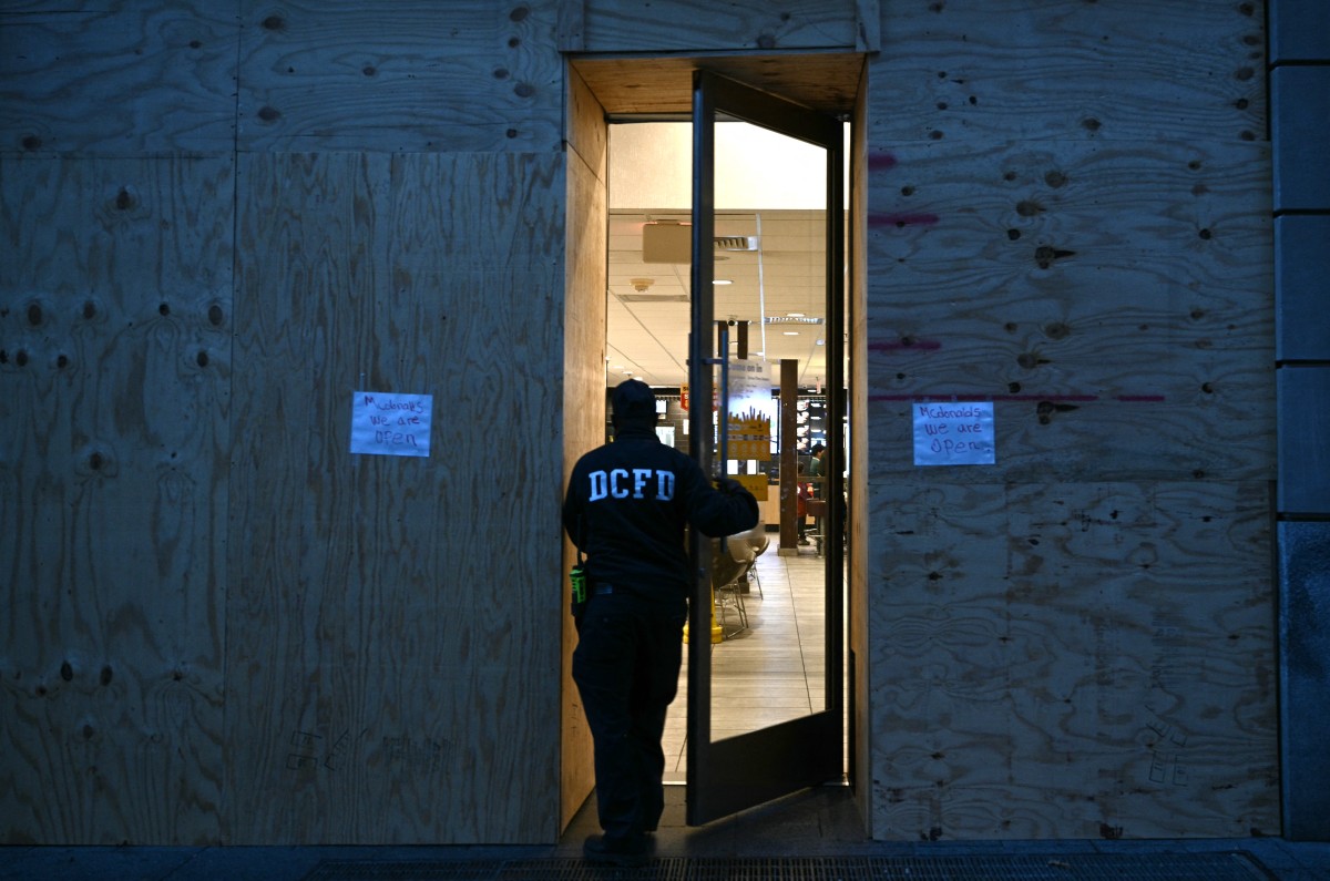 A DC fire fighter enters a boarded up McDonald's restaurant in downtown Washington, DC, on November 4, 2024, ahead of possible violence on and after the November 5 election. Photo by Brendan SMIALOWSKI / AFP.