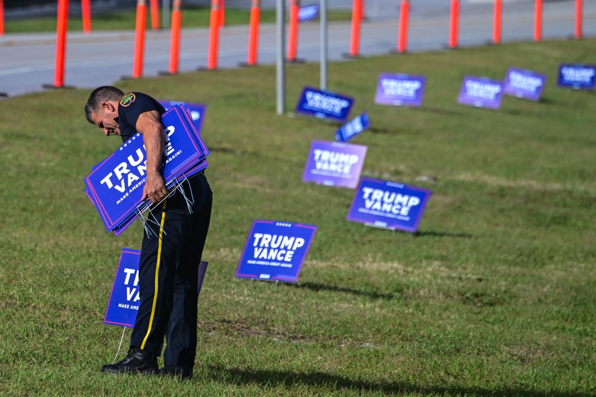 Palm Beach police officers remove political signs near Mar-a-Lago, the residence of former US president and Republican presidential candidate Donald Trump, in Palm Beach, Florida, on Election Day November 5, 2024. Photo by GIORGIO VIERA / AFP.