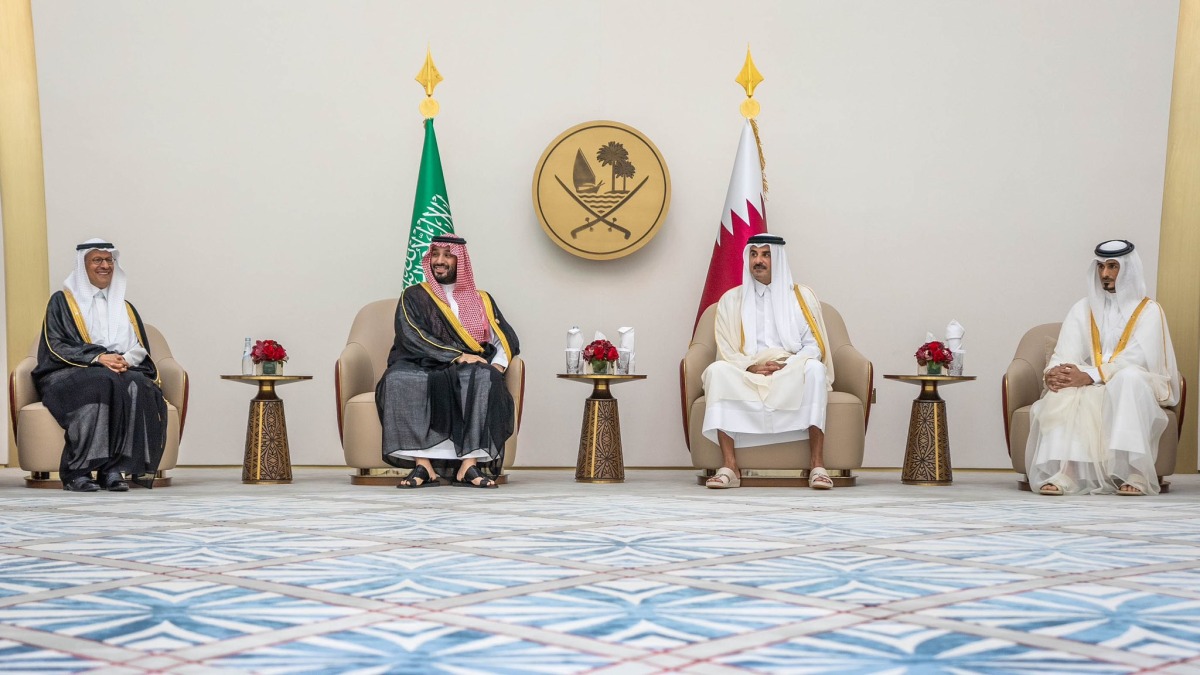 Doha, Qatar: HH the Amir Sheikh Tamim bin Hamad Al-Thani led the well-wishers to welcome his brother HRH Crown Prince and Prime Minister of the sisterly Kingdom of Saudi Arabia Prince Mohammed bin Salman bin Abdulaziz Al Saud upon his arrival at Hamad International Airport (HIA) Amiri Terminal to preside over the delegation of the Kingdom of Saudi Arabia to the 44th Summit of the Gulf Cooperation Council (GCC) Supreme Council, which Doha hosts Tuesday.