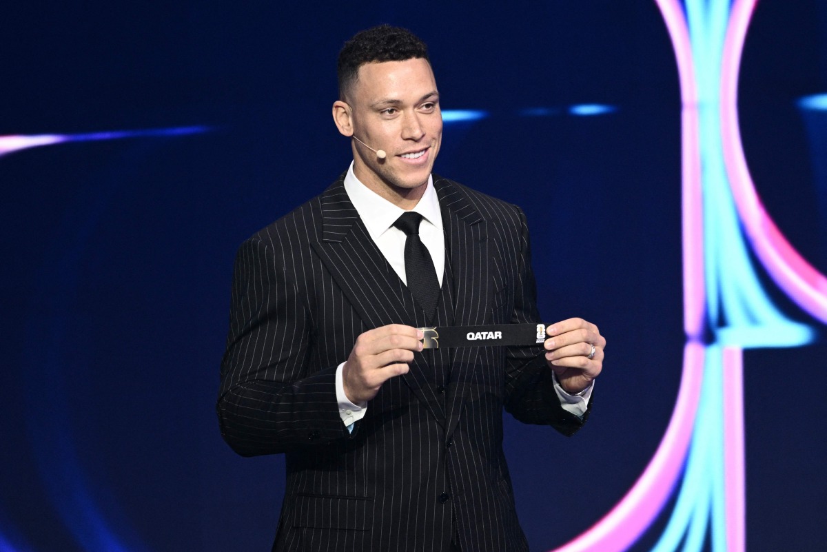 US baseball player Aaron Judge shows the card reading Qatar during the draw for the 2026 FIFA Football World Cup taking place in the US, Canada and Mexico, at the Kennedy Center, in Washington, DC, on December 5, 2025. (Photo by SAUL LOEB / AFP)