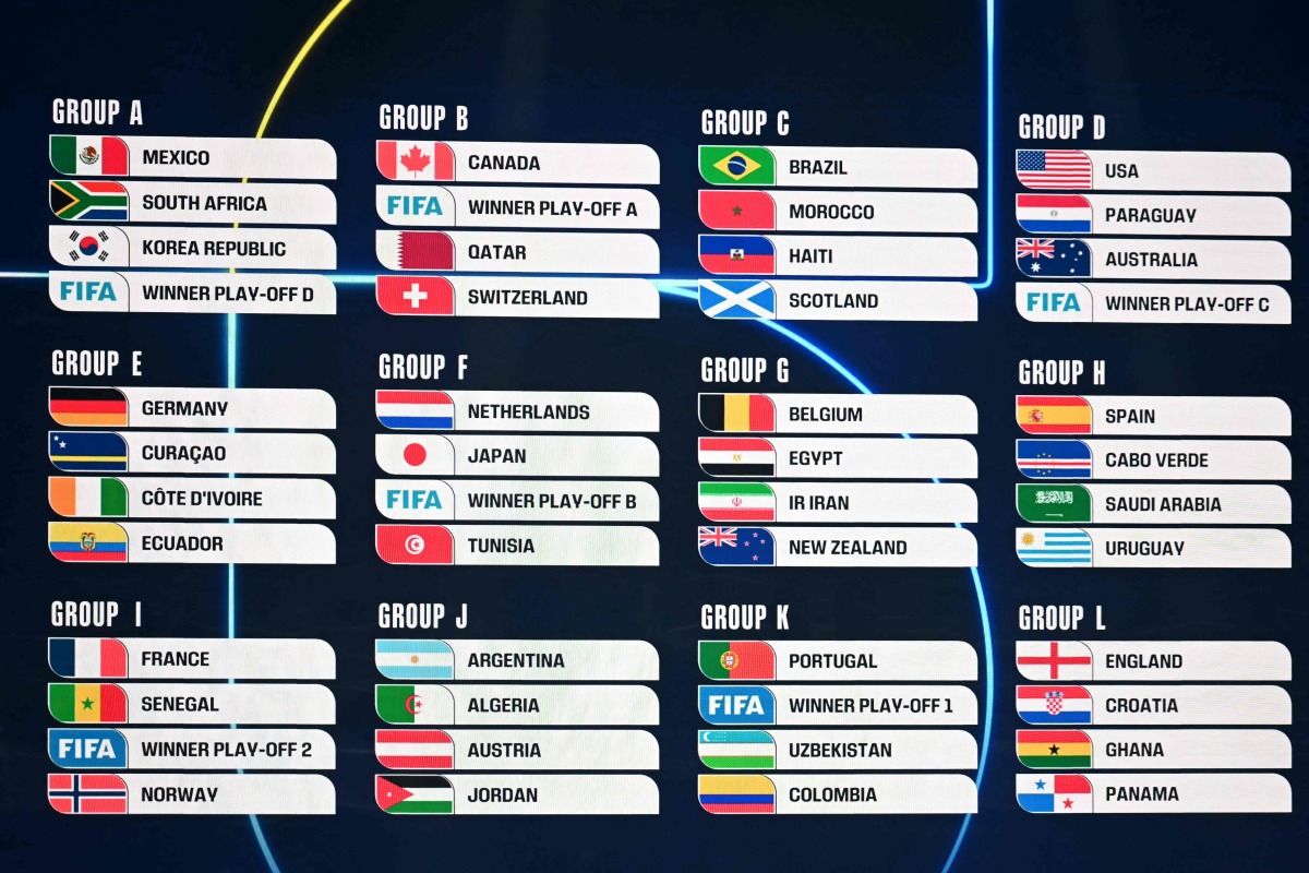 A picture shows groups A, B, C, D, E, F, G, H, I, J, K and L during the draw for the 2026 FIFA Football World Cup taking place in the US, Canada and Mexico, at the Kennedy Center, in Washington, DC, on December 5, 2025. (Photo by Roberto SCHMIDT / AFP)