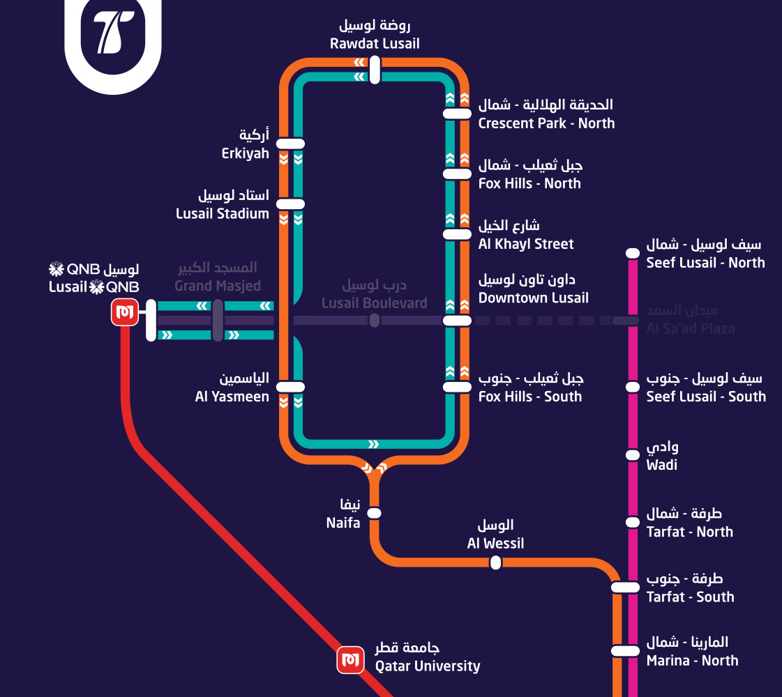 The opening of the Turquoise Line introduces the Lusail QNB interchange station, which now operates alongside Legtaifiya station.