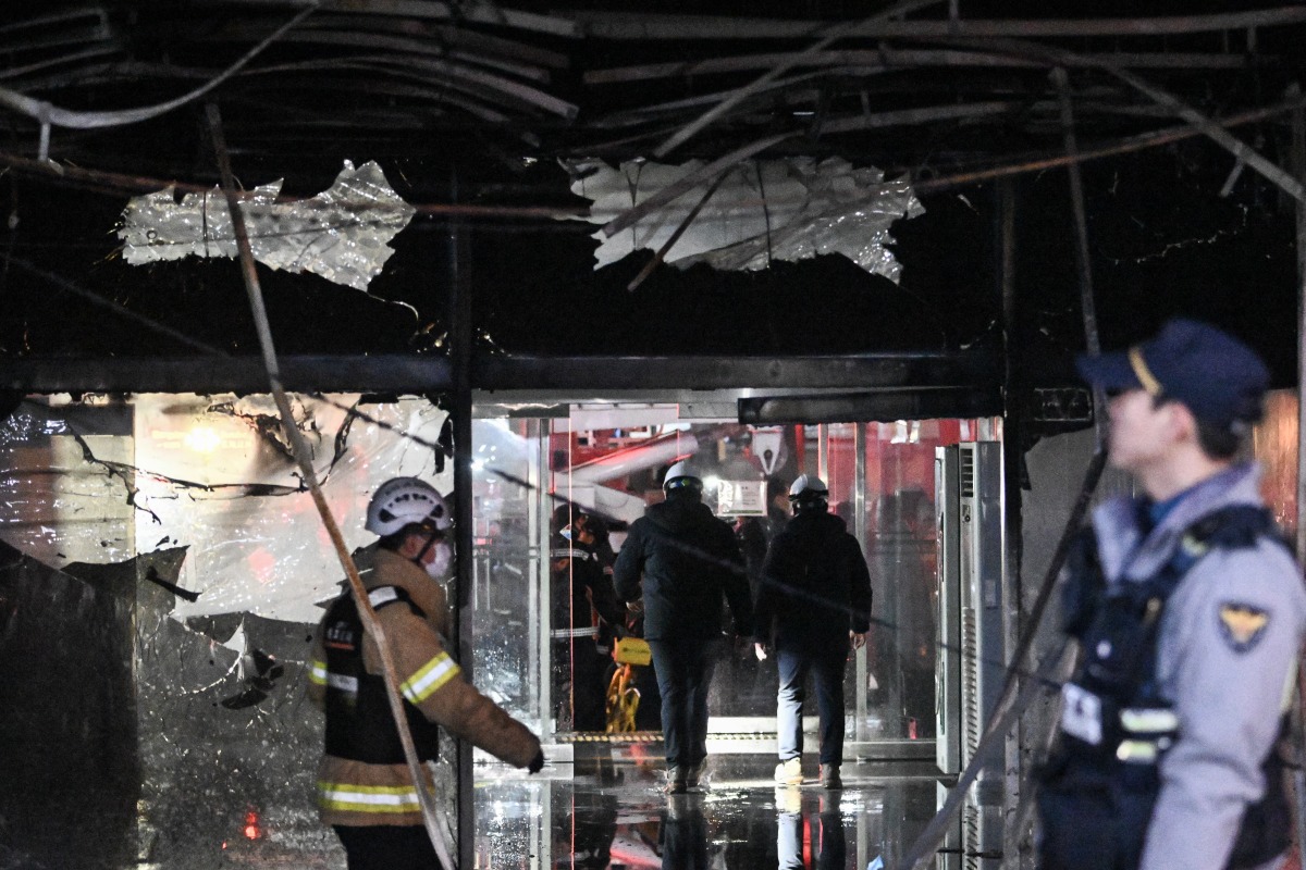 Investigators and firefighters are seen at the entrance of a damaged commercial building in the aftermath of a fire that broke out at the Bundang district in Seongnam on January 3, 2025. Photo by Philip FONG / AFP
