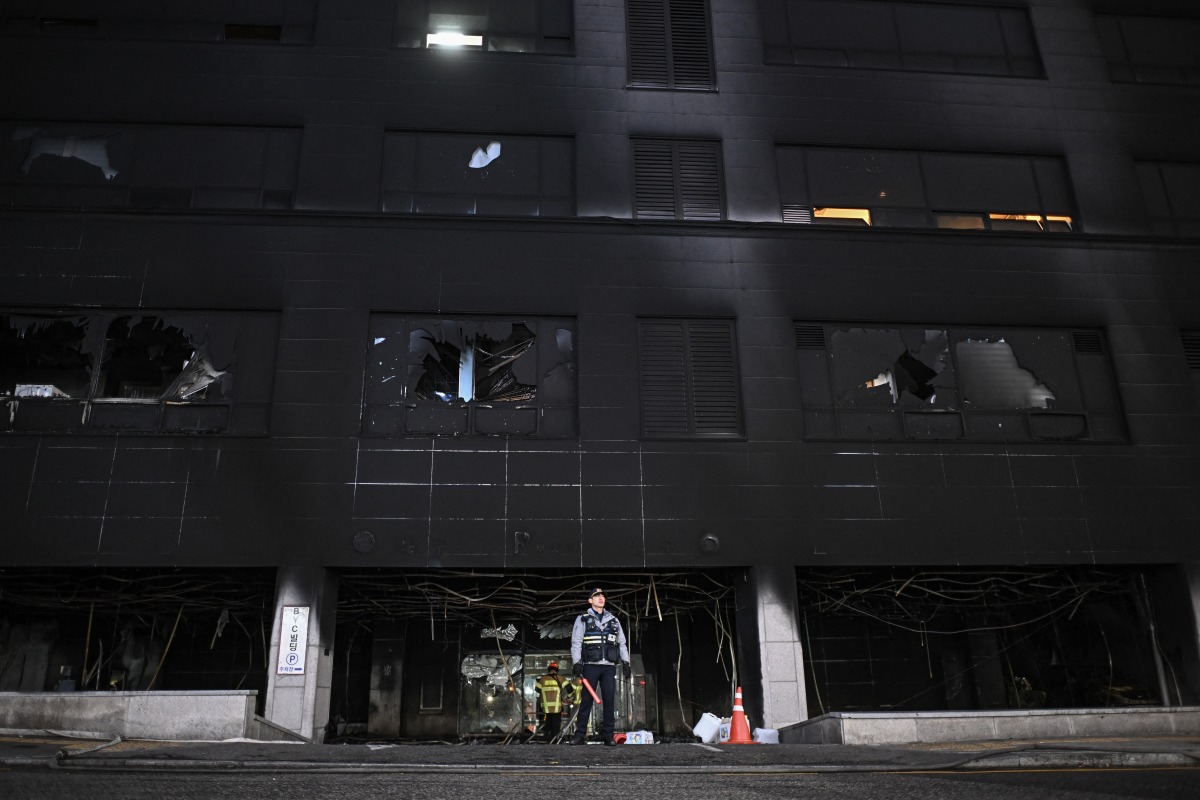 A firefighter stands in front of a commercial building that was damaged in a fire at the Bundang district in Seongnam on January 3, 2025. Photo by Philip FONG / AFP