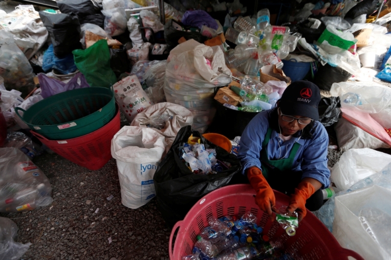 Bangkok: At a Buddhist temple south of Bangkok, a monk watches as a machine presses down on thousands of water bottles, before a giant bale of crushed plastic rolls out with a thud.