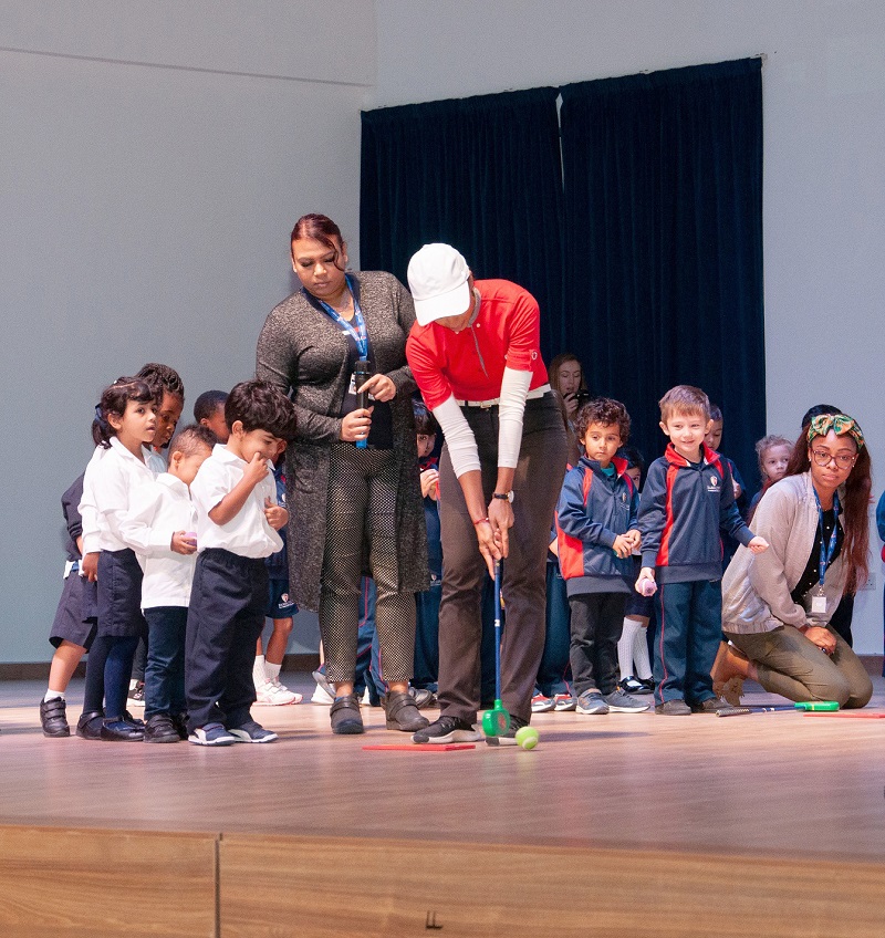 The assembly was attended by over 200 students, from 3 to 11 years old, where they had the opportunity to listen to Yasmian as she talked to them about the importance of being passionate about something and working hard to achieve it. Yasmian shared her journey as a woman in sports, her life lessons and how they groomed her to be the person that she is today. Students were given an opportunity to ask questions, enjoy golf demonstrations and take pictures with the Qatari golfing star.