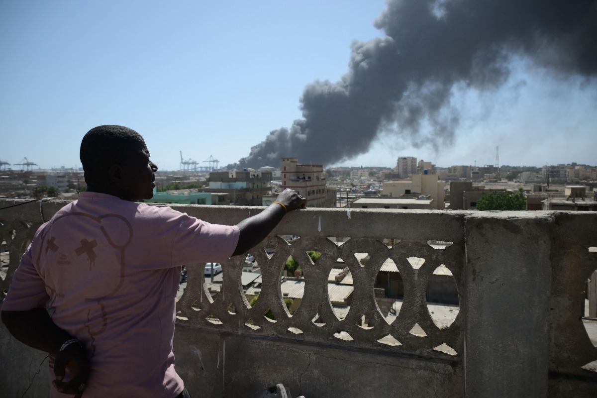 A man watches as smoke billows after a drone strike on the port of Port Sudan on May 6, 2025. Drones struck the airport and targeted an army base in Port Sudan on May 6, officials said, the third straight day the Sudanese army-aligned government's seat of power has come under attack. (Photo by AFP)