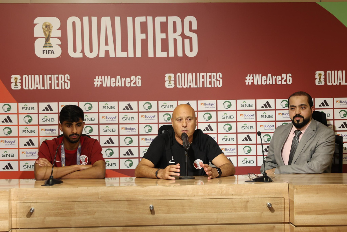 Qatar coach Marquez Lopez speaks during a press conference yesterday as Al Annabi player Naif Al Hadhrami looks on.