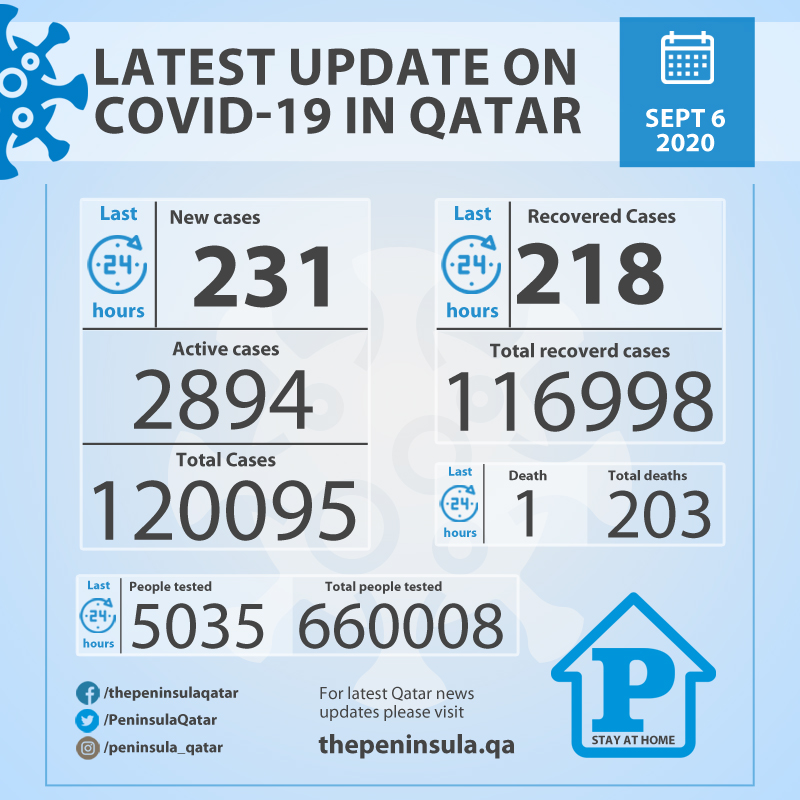 Doha: Ministry of Public Health (MoPH) today recorded 231 new cases of coronavirus (COVID-19) and 218 people recovered from the virus in the last 24 hours, bringing the total number of people recovered in Qatar to 116,998.