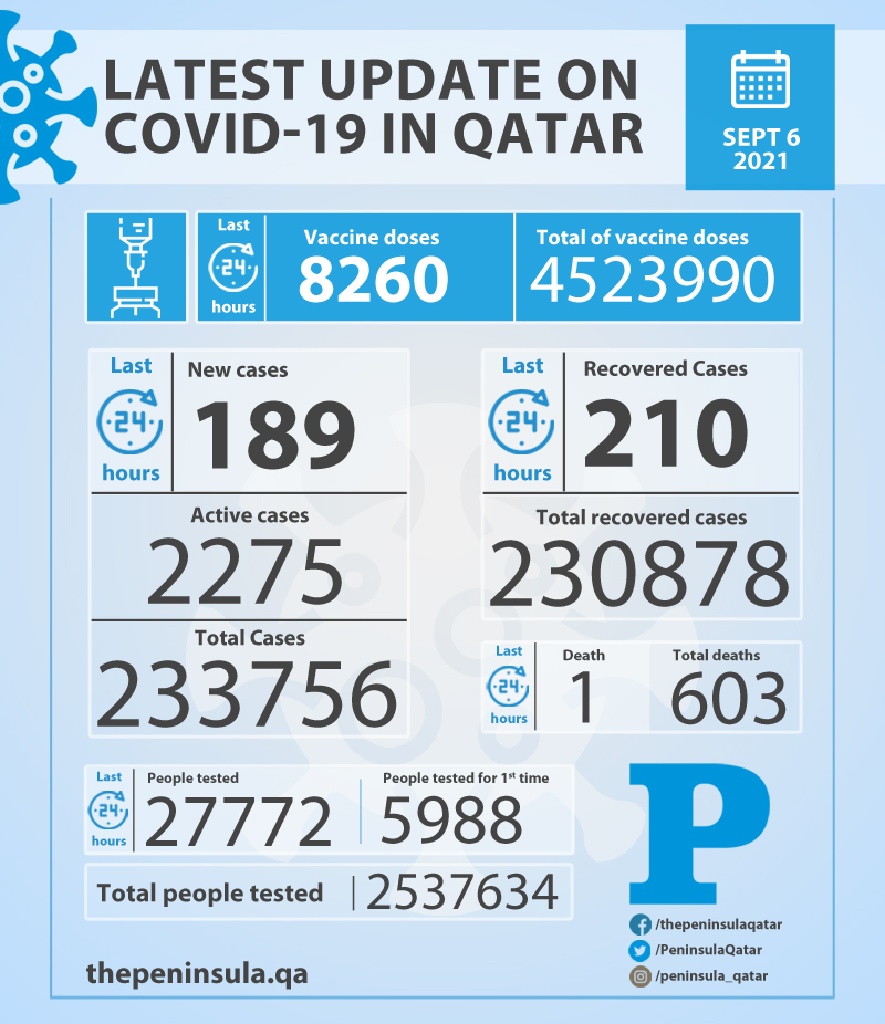 Doha: Ministry of Public Health (MoPH) today reported 189 new cases of coronavirus (Covid-19) and 210 people recovered from the virus in the last 24 hours, bringing the total number of people recovered in Qatar to 230,878.