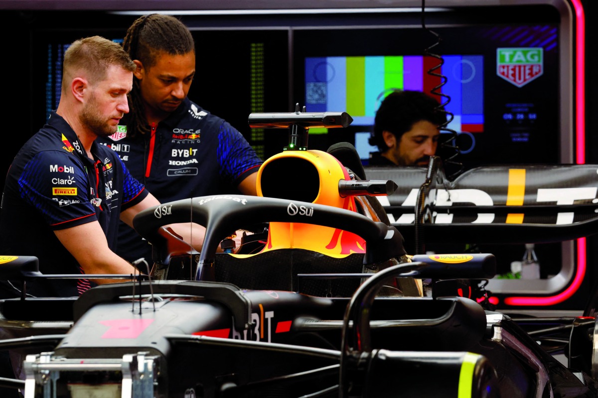 Red Bull’s mechanics work on a car at the circuit.