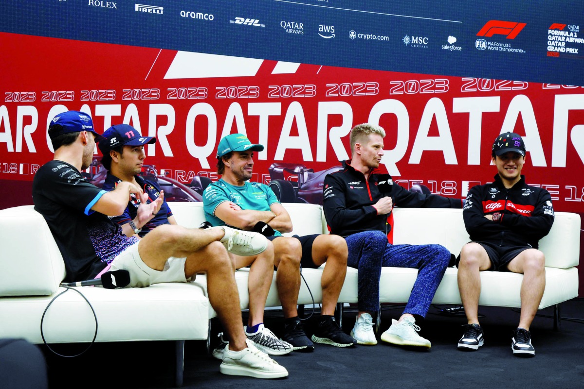 FROM LEFT: Alpine’s Pierre Gasly, Red Bull Racing’s Sergio Perez, Aston Martin’s Fernando Alonso, Haas' Nico Hulkenberg, and Alfa Romeo’s Zhou Guanyu during a press conference in Lusail, yesterday.