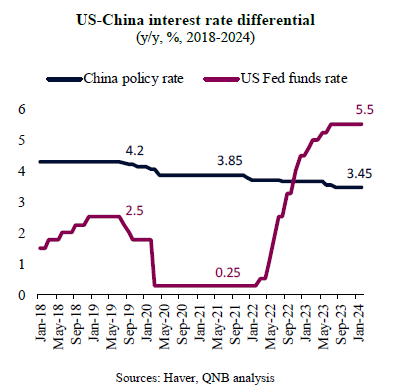 Second, the start of the easing cycle in the US later this year is also set to support a more aggressive round of stimulus by the PBoC. Once the Fed starts cutting rates for the first time in more than four years, the PBoC will have more policy room to ease further without creating additional incentives for capital outflows from China. In recent years, the US-China interest rate differential changed dramatically in favour of the US, with higher US yields attracting capital inflows from the rest of the world, including China.
