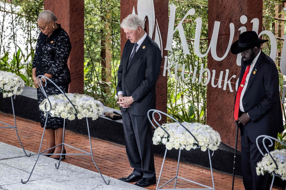 (From L to R) Former First Lady of South Africa and former South African President Nelson Mandela's wife Graca Machel, Former President of the United Stated Bill Clinton and President of South Sudan Salva Kiir react in front of a wreath during the commemorations of the 30th Anniversary of the 1994 Rwandan genocide at the Kigali Genocide Memorial in Kigali on April 7, 2024. (Photo by LUIS TATO / AFP)
